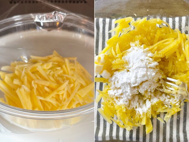 じゃがいもを細切りしレンジ加熱し軽く潰して片栗粉を混ぜる