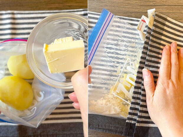 ジッパー付き保存袋に入れ、熱いうちに潰してバターときび砂糖を加えてよく揉みます。じゃがいもが熱いので、火傷をしないように布巾の上から潰すと良いです。バターときび砂糖が溶けたら、牛乳を半分ずつ加えながら混ぜます。