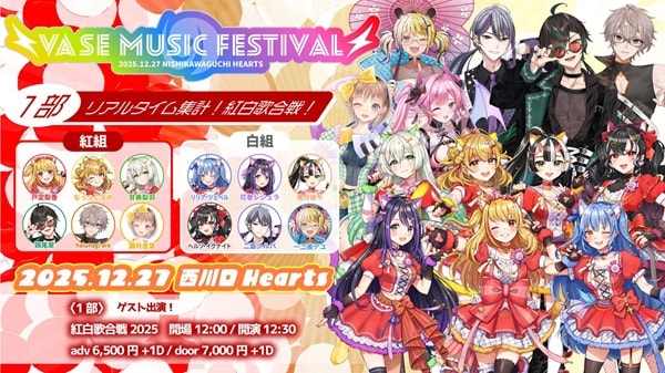 「VASE MUSIC FESTIVAL 2025」は、1部が「紅白歌合戦2025」で12:00オープン、12:30スタート。前売り券は6,500円+1D。2部は「ワチャロック!」で17:30オープン、18:00スタート。前売り券は7,500円+1Dだ。