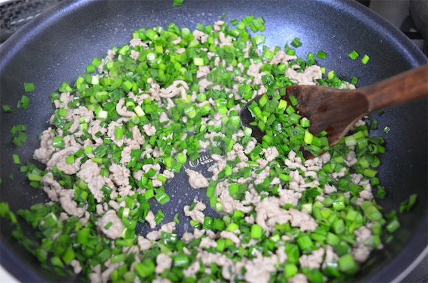 2. ニラは5mm幅に切り、豚ひき肉と一緒にバターを熱したフライパンで炒める。