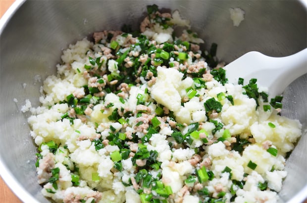 1. じゃがいもは皮を剥き、軟らかくなるまで水から煮たらボウルに移してマッシャーなどで潰す。