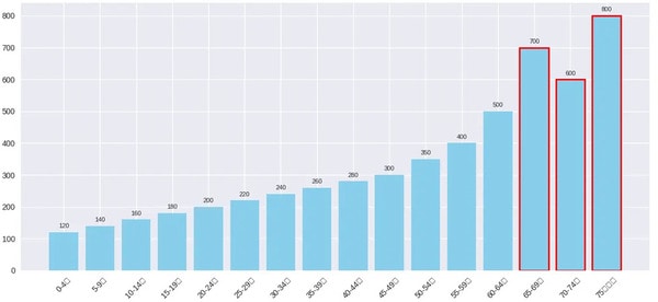 同エリアの年齢別棒グラフ(2020年国勢調査より)※縦軸:人数/横軸:年齢で、右端が75歳以上から順に5歳ずつ下がる