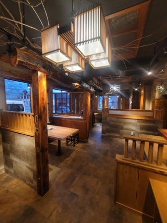仕切りのあるテーブル席や掘り炬燵の席など、白馬の自然になじむ静かな空間で、ゆったりと食事が楽しめる。