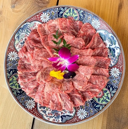 「飛騨牛カルビ盛合せ」100g/1,980円(税込)は、上質な飛騨牛カルビが100gから400gまで好きなボリュームで楽しめる。焼くほどに広がる甘い脂の香りと飛騨牛ならではの深い旨みが堪能でき、華やかな盛り付けは“特別な一皿”としても人気。白馬で味わう贅沢な時間をより一層引き立てるメニューだ。
