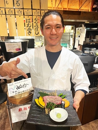 店長・菅原さんによると、看板メニューの「飛騨牛カルビ」をはじめ、すべてA5ランクのみを扱っており、熟練の目利きが選び抜いた飛騨牛は、愛知の自社工場で専門の職人が塊肉から丁寧に捌き、その日のうちに各店舗へ向けて直送。鮮度にこだわった“切りたて”の美味しさが楽しめるという。また店内でも手切りにこだわり、ほぼすべてのお肉を職人がカット。店内の精米機で精米したてのお米を使用し、釜炊きでふっくら炊き上げるご飯は飛騨牛と相性抜群なのだとか。