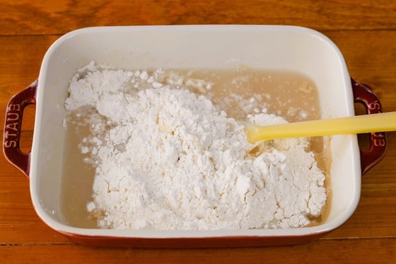 2. ドライイーストと強力粉を加え、イーストのダマが残らないようにスプーンでしっかりと混ぜる。