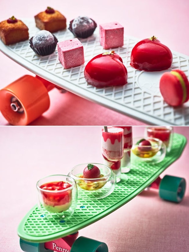 いちごを思う存分満喫できる10種類のスイーツは、味わいだけでなく見た目もかわいらしく華やかに仕上げられている。アーモンドやヘーゼルナッツ、ピスタチオ、チョコレートなどのリッチなフレーバーと、柚子やレモングラスなど爽やかで繊細な香りが織りなすスイーツは、一つひとつが熟練のパティシエによって生み出される至極の逸品。