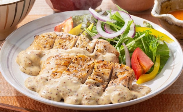 炭火で焼き上げたジューシーなチキンに、隠し味にチーズを加えたクリーミーな粒マスタードソースを合わせた一品。粗挽き黒胡椒をアクセントに、チーズのコクとマスタードの辛みが絡み合う洋風炭火焼きチキン。
