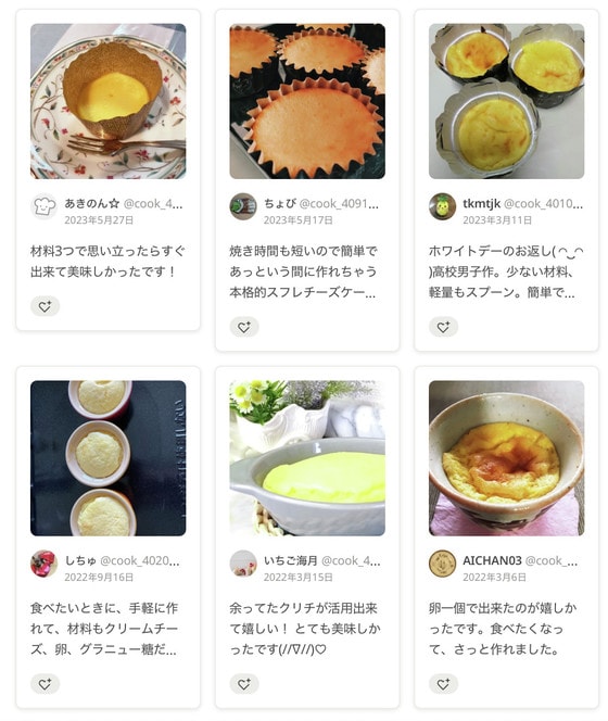 つくれぽ(つくりましたフォトレポートのこと)にも「食べたいときに思い立ったらすぐに作れて、おいしい」「卵1個で作れて嬉しい」「焼き時間も短くて作りやすい」「粉なしで作りやすい」などの嬉しい声が150件以上も届いています。