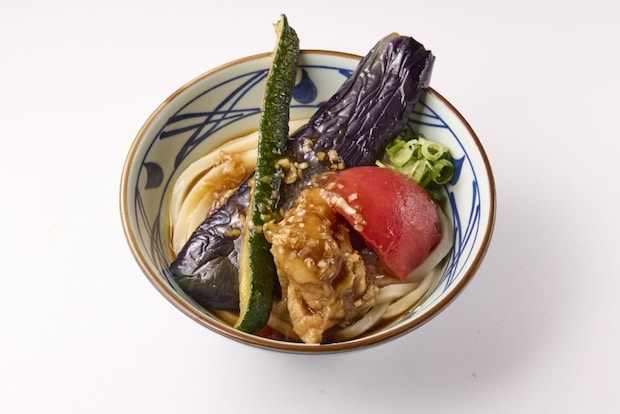 沖縄県産のハーブ鶏「ピュアやんばる」のから揚げと、特製のだしに漬け込んだ野菜の揚げびたしを乗せたぶっかけうどん。なお、やんばる鶏のから揚げは単品でも販売する。