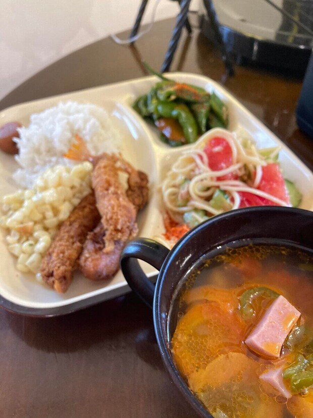 昼食はブッフェ形式。お肉、野菜、サラダ、そしてあたたかいごはんとスープ。