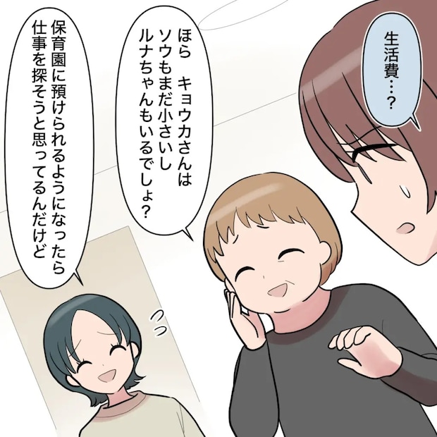 「生活費・・・?」私は眉をひそめて聞き返しました。「ほら、キョウカさんはソウもまだ小さいし、ルナちゃんもいるでしょ?」「保育園に預けられるようになったら仕事を探そうと思ってるんだけど」義母とキョウカさんはそう言いますが、義弟であるトモヤが援助しなければならない理由にはなりません。