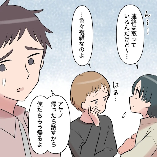 「色々複雑なのよ」義母とキョウカさんの様子から、ナオキさんからの養育費はほとんど期待できないのだと察しました。とはいえ、うちだって親戚の生活費まで背負えるほど余裕があるわけではありません。どうしたものかと考え込んでいると、トモヤが「アヤノ、帰ったら話すからもう帰るよ」と声をかけてきました。