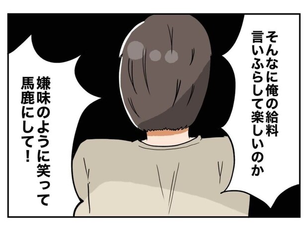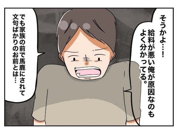 そんなある日、メイカ夫婦は夫のいとこの結婚式に招待され参加。ただ夫が「用意しておいて」と言ったご祝儀の5万円はメイカがコツコツ貯めていた家族旅行のための貯金から出すことに…。いつも家計に余裕がないメイカはイライラしながら結婚式に出席。そこで夫が褒められている姿を見てつい「夫の給料は18万円で余裕なんてない」と暴露してしまったのですが…?