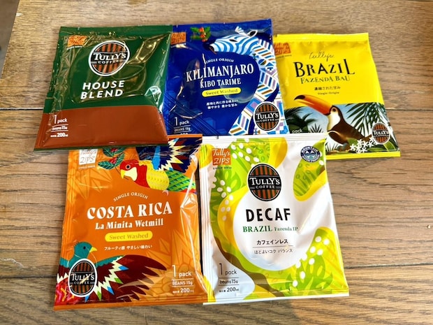 5つのパックの中身はそれぞれ異なる種類のコーヒーで、タリーズのハウスブレンドからカフェインレスのものまで入っているので、家族で好みに合わせて選べます。