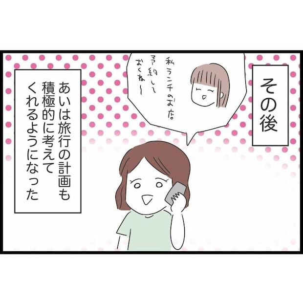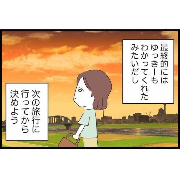 「2人がそう言うならわかったよ」と言い一応納得してくれたゆっきー。もう2人と旅行には行くまいと思っていたすみれですが、もう一度だけ行ってから決めようと考えを改めます。次の旅行では計画を積極的に考えてくれたり、ガソリン代を2人が払ってくれるなどすみれへの配慮が感じられました。すみれは、友人たちが変わったことで旅行が楽しくなったようです。