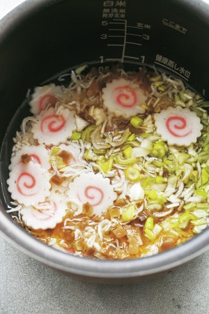 2. 炊飯器に洗った米と規定量の水、卵以外の材料を入れて炊飯する。