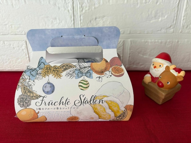 可愛くデザインされたBOXに入ったシュトーレン。 シュトーレンは、クリスマスを心待ちにしながら毎日少しずつスライスして食べるドイツの伝統菓子です。