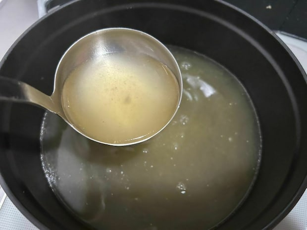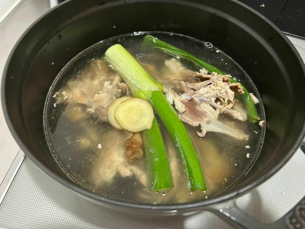説明書通り、残った骨とネギ、生姜をお鍋に入れて煮込むと、鶏の出汁と旨味がしっかりと溶け出したつやつやスープが完成しました。