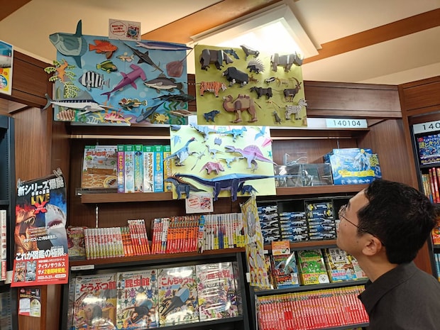 学習参考書の棚には、小学館の『図鑑NEO』シリーズの立体折り紙が。一つずつ、綺麗に作られたものが展示されていた。
