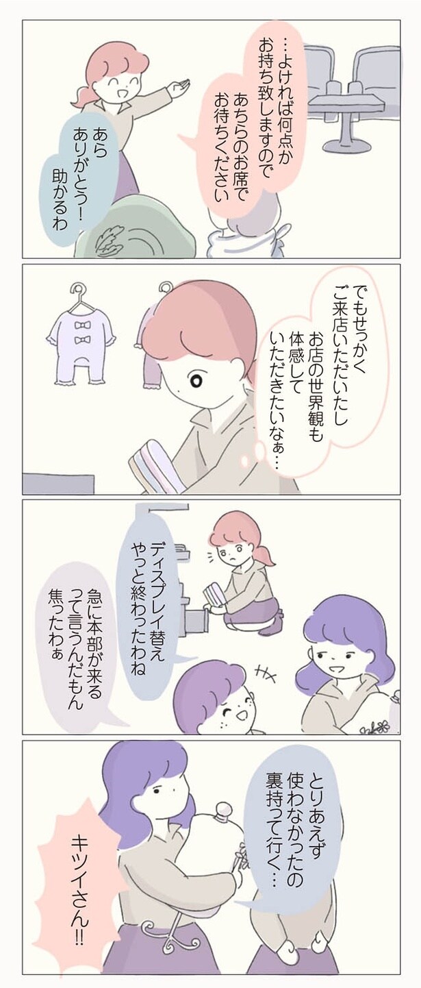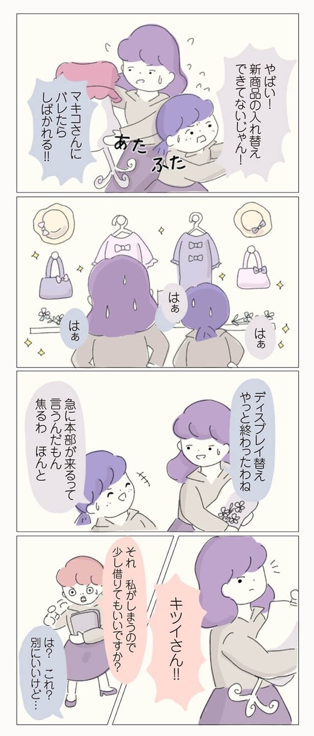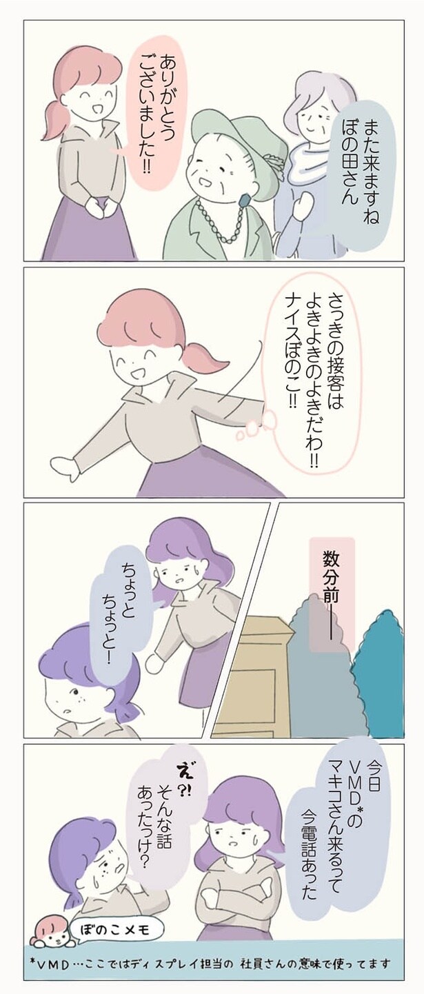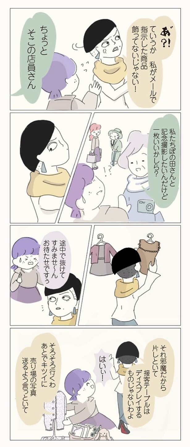 子ども服ブランドでショップ店員をしているぼのこは、数ある店舗の中でも花形のB店へ異動が決まった。B店は花形と言われる一方で、昔からの派閥争いが有名。新人や異動してきたスタッフがすぐに退職してしまうという疑惑があるのだった。緊張の中、異動初日を迎えたぼのこは、早速、店長やスタッフたちから理不尽な思いを受ける。ねちねちマウンティングや悪口に陰口、過剰な先輩優先システムなど…。やがて心身ともに疲弊したぼのこは、この店舗に誰一人味方がいないことを確信。お店の悪しき風習を断ち、スタッフたちに「復讐」するため、ぼのこは店長を目指すことを決意するのだった――。