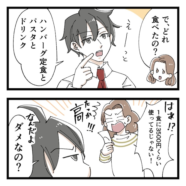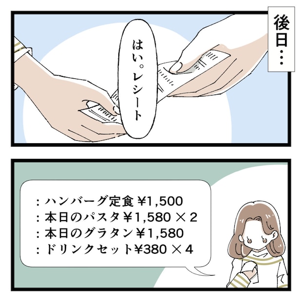 ところがレシートの内容の中で、ショウが食べた分を支払おうと確認すると、ハンバーグ定食にパスタも食べて、ドリンクを付けたと言うので、高校生の友達との食事1食に約3,500円も使っていることに驚いた私は「はぁ!?」と思わず大きな声が出てしまいました。それでもショウは「ダメなの?」と言い張りました。