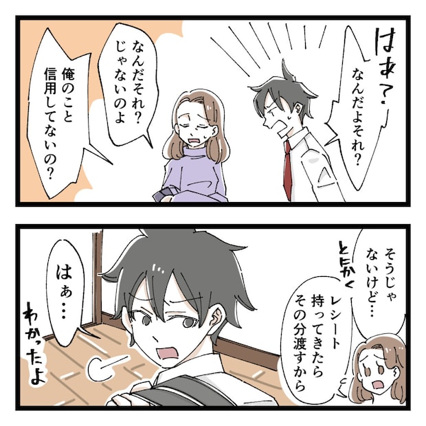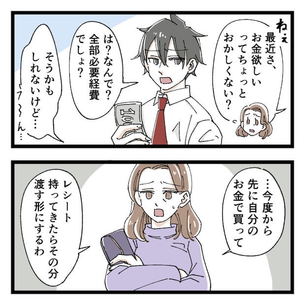 頻繁にお金をせがまる私は、少しおかしいなと感じ始めたのでショウにずばり聞いてみました。すると困ったような顔で全部必要経費だと言うショウ。そうかもしれないけど、と納得しかけた私でしたが、お金を渡すルールを変更することにしました。今度から、先にショウに立て替えさせて、レシートを持ってきたらその分を渡すようにすると宣言したのです。