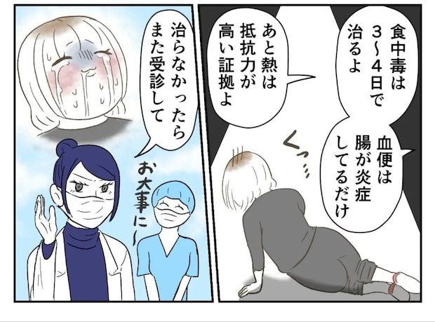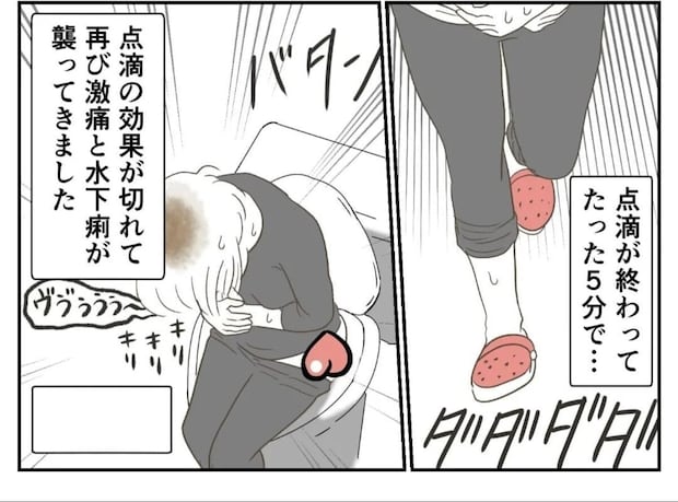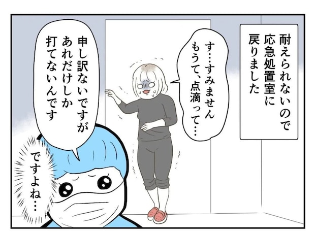 発熱と下痢の症状があったため、尾持さんは入院を覚悟していました。ところが、帰宅することに。痛みに耐えきれず、応急処置室に戻りますが、ダメでした…。