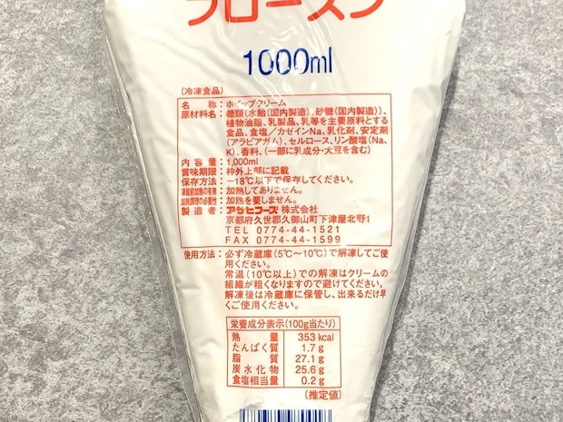 内容量は1,000mlで、冷凍状態で売られているホイップクリーム。価格は321円(税込)と、業務スーパーらしく大容量ながら買い求めやすい商品となっています!