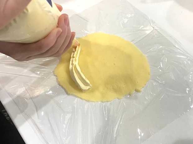 まず、クレープ生地の上にカスタードホイップを抽出していきます。本品にもしぼり口が付いているので、盛り付けのしやすさは抜群です!