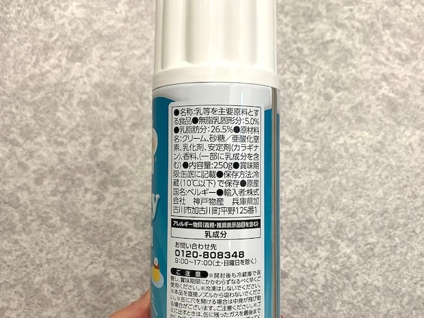青色の爽やかなパッケージデザインが目を引く商品。ベルギー産のホイップクリームで、内容量は250g、価格は473円(税込)となっています。