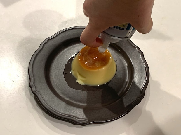 本品を使用する際はスプレー缶を振り、ノズルを下に向けてホイップクリームを抽出します。今回はプリンの上にホイップクリームを乗せてみることにしました。