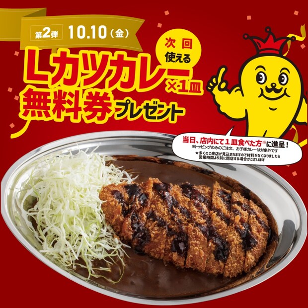 10月10日限定で「カレーのチャンピオン」「チャンピオンカレー」全店にて、店内でカレー1皿(お子様カレーを除く)を注文した人に、次回の来店時に使える「Lカツカレー(レギュラーサイズ)無料券」1枚をプレゼントする。