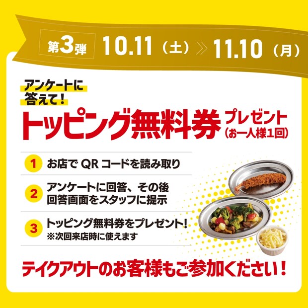 10月11日~11月10日の期間中、店舗のQRコードからアンケートに回答し、最後の画面をスタッフに見せると、次回使える「トッピング無料券」(カレーを注文の際に利用可能)がもらえる。テイクアウトの利用客も参加可能。1人1回限り。