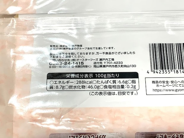 カロリーに関しては100gあたり288kcal。他のメーカーのスポンジシートも調べてみましたが、おおよそ300kcal前後だったので、スポンジシートとしては平均的な数値のようです。