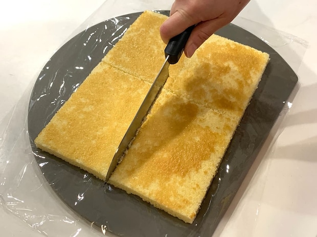 スポンジシートを重ねて作るので、最初にスポンジシートを4等分にカット。そのうち3枚をショートケーキに使用します!