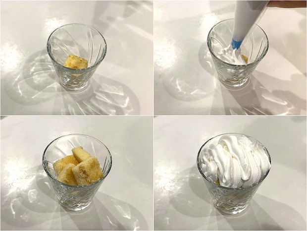 まず、スポンジシートを小さく四角形にカットし、器の底に入れます。その後はホイップクリーム、スポンジシート、ホイップクリームの順番に重ねてみました!