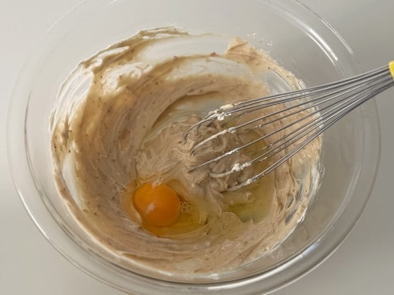 2. きび砂糖、卵、ヨーグルト、レモン汁の順で加え、混ぜます。