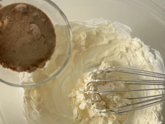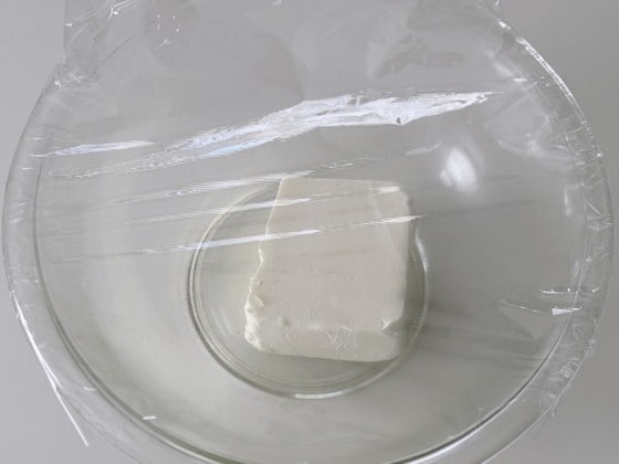 1. クリームチーズを耐熱容器に入れてラップをし、600Wの電子レンジで30秒加熱したあと、なめらかになるまで混ぜます。