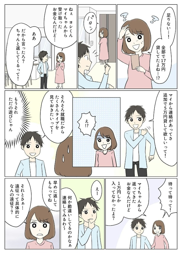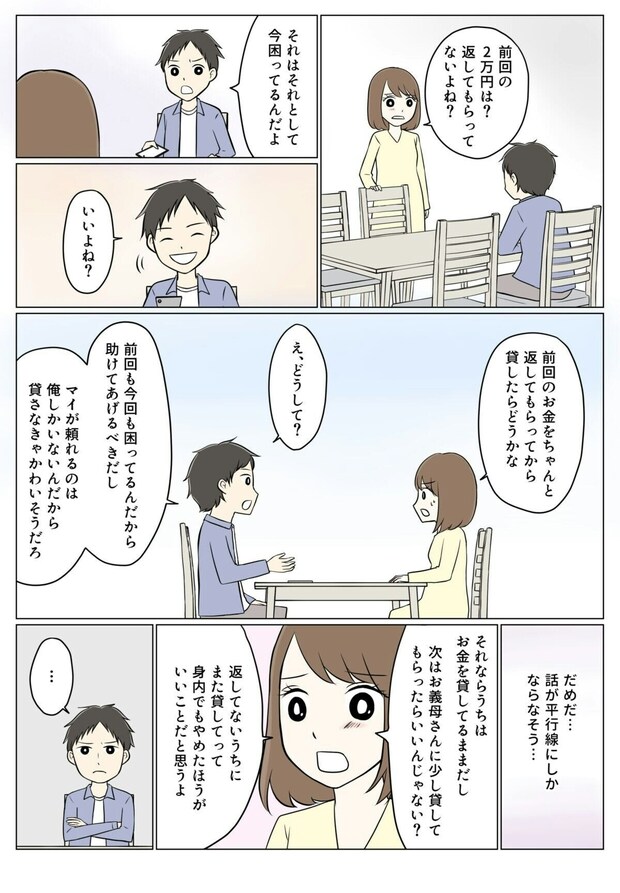 お金を貸すことに対し、たとえ家族であっても抵抗があるアイコ。家族ならば助け合って当たり前という、夫。本当に困っているのであれば状況は違いますが、マイの場合、単に「遊びのためのお金」という印象を受けますよね…。