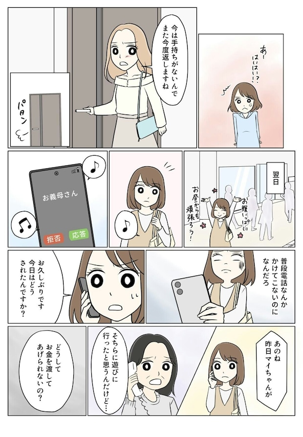 借りたお金を返さず、悪びれる様子もない、義妹。翌日、義母から「なぜお金を渡してあげられないの?」と、電話が来ます。義母もまた「困ったときはお互いさまなんだから」と言いますが、アイコはその言い分に納得できていませんでした。