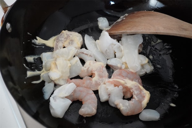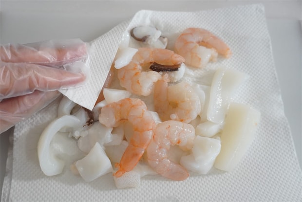 今回は、冷凍のシーフードミックスを使いましたが、生の剥きエビやイカなどでも良さそうです。