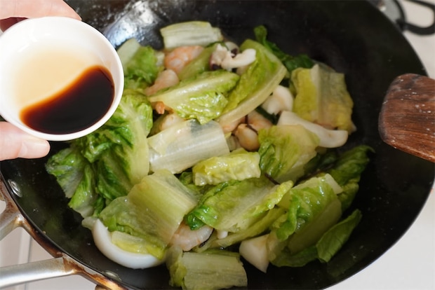 ロメインレタスがしんなりしたら、しょうゆを回し入れます。