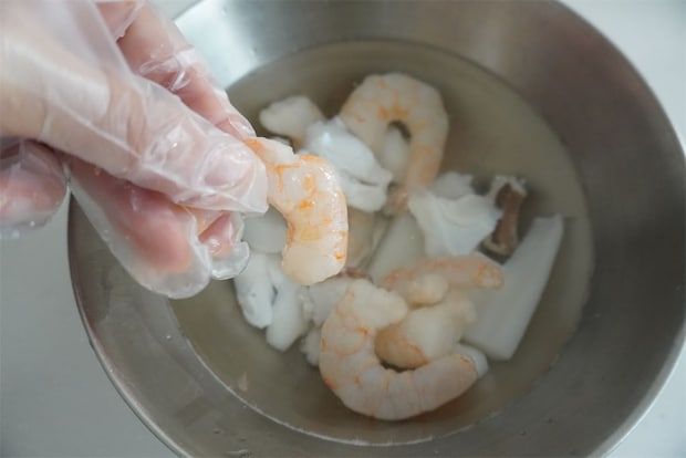 ・シーフードミックスは塩水に浸けて解凍すると、おいしさをキープできるのでオススメです。冬は約1時間、夏は約30分を目安に解凍してください。