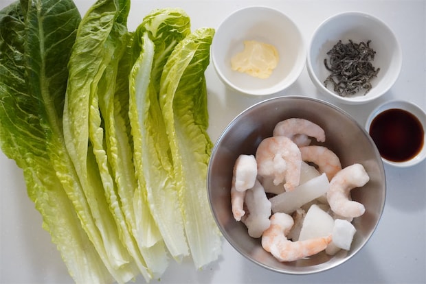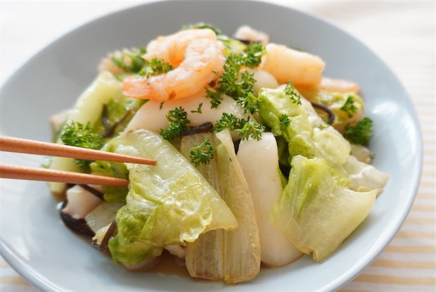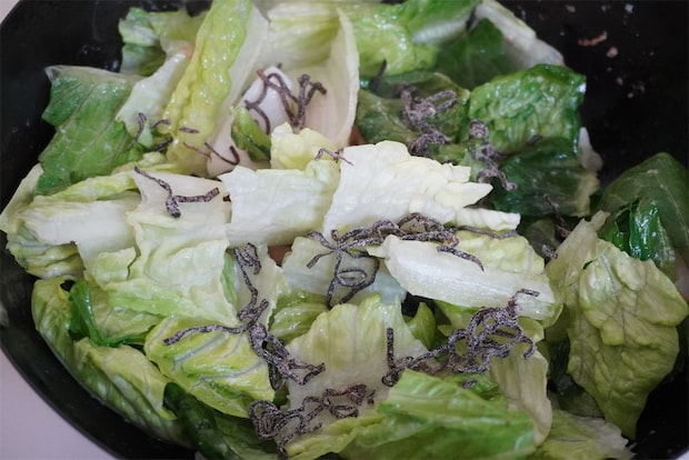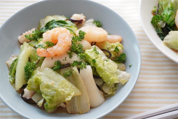 シーフードミックスに火が通ったら、ロメインレタスと塩昆布を加えます。