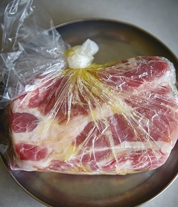 下味の塩は"味つけ”、砂糖は“焼き色”、オリーブオイルは"保湿”の役割。1日漬けると豚肉は旨みが引き出され、食感も柔らかに。