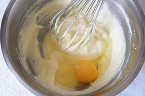 ボウルにバターと砂糖を入れて混ぜ、卵を1個ずつ加えて混ぜていきます。さらに、アーモンドプードルや薄力粉を入れて混ぜます。