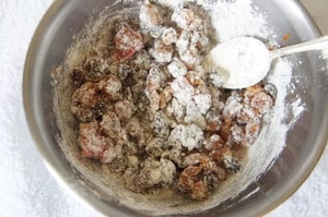 別のボウルに洋酒漬けのドライフルーツを入れ、薄力粉などをまぶします。