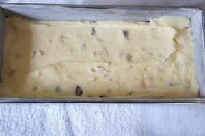 生地とフルーツを合わせたら、パウンド型に入れます。