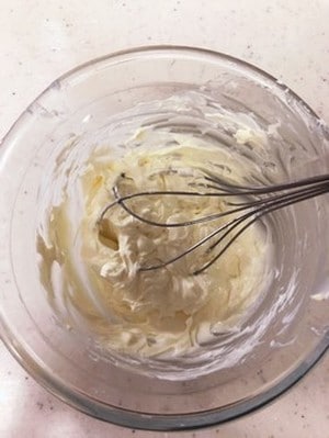 クリームチーズを耐熱容器に入れてレンジで加熱し、柔らかくなったら泡立て器で丁寧によく混ぜます。クリーム状になるまで混ぜるのがポイントです。
